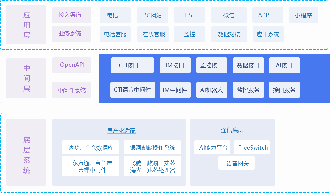 場景詳情采用中間層方式將應(yīng)用與底層進(jìn)行分隔,屏蔽復(fù)雜的語音通信技術(shù)及AI人工智能技術(shù),集成商負(fù)責(zé)應(yīng)用層開發(fā),調(diào)用簡單接口即可完成集成工作。