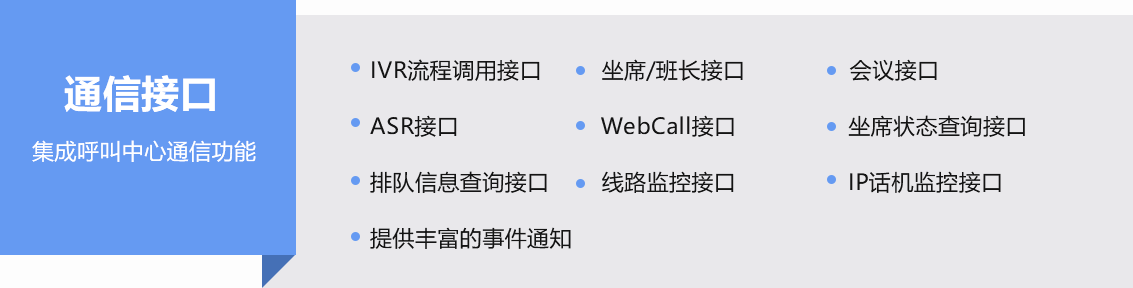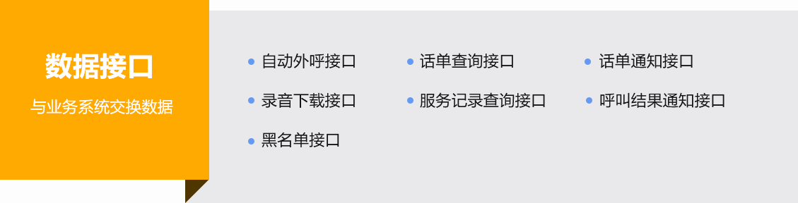 提供豐富的二次開發(fā)接口(如:通信接口、數(shù)據(jù)接口、AI機(jī)器人接口等),輕松構(gòu)建全渠道智能呼叫中心系統(tǒng)。