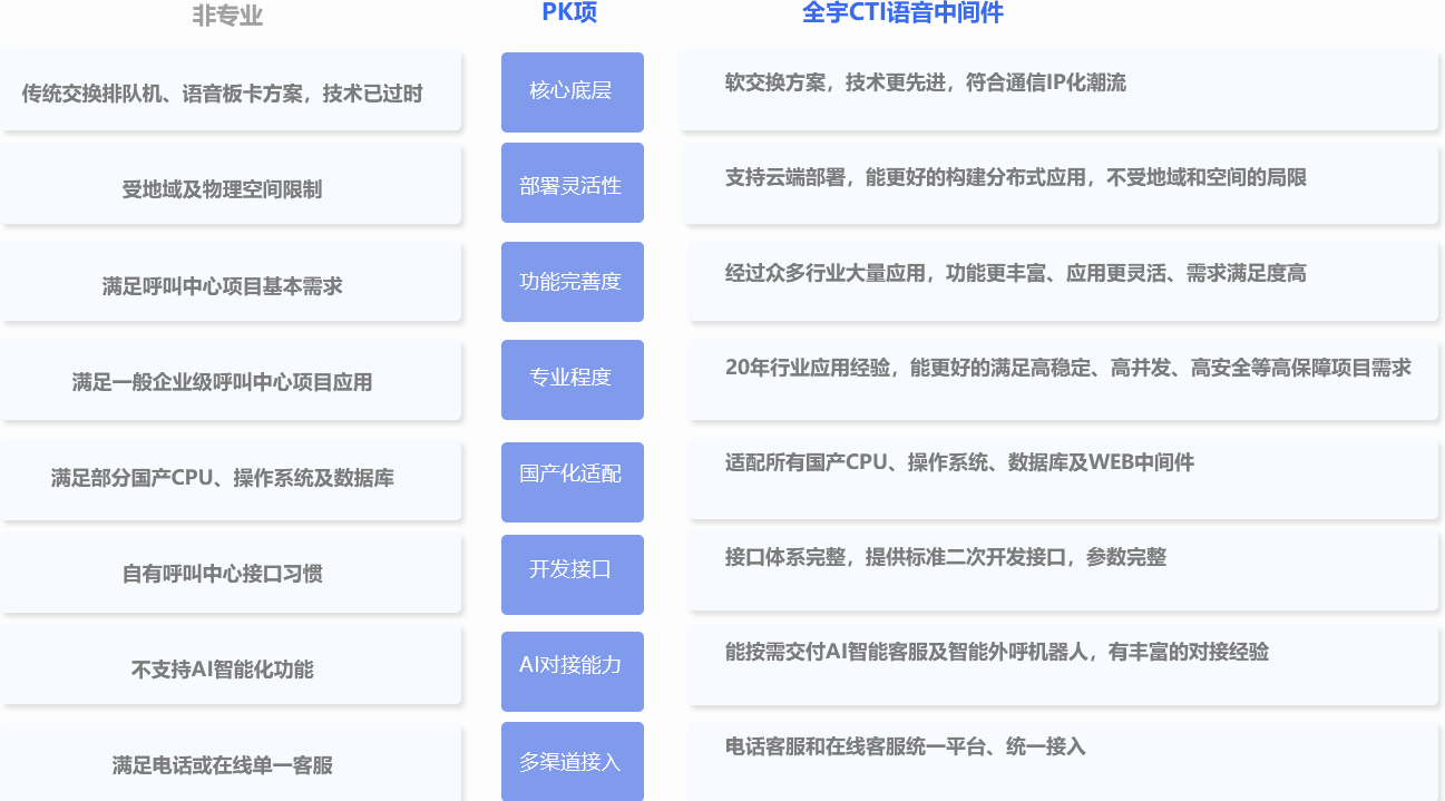 全宇CTI語音中間件支持SIP軟電話、WEBRTC網(wǎng)頁電話、AI機(jī)器人對接、與IM集成為客服統(tǒng)一平臺等等。